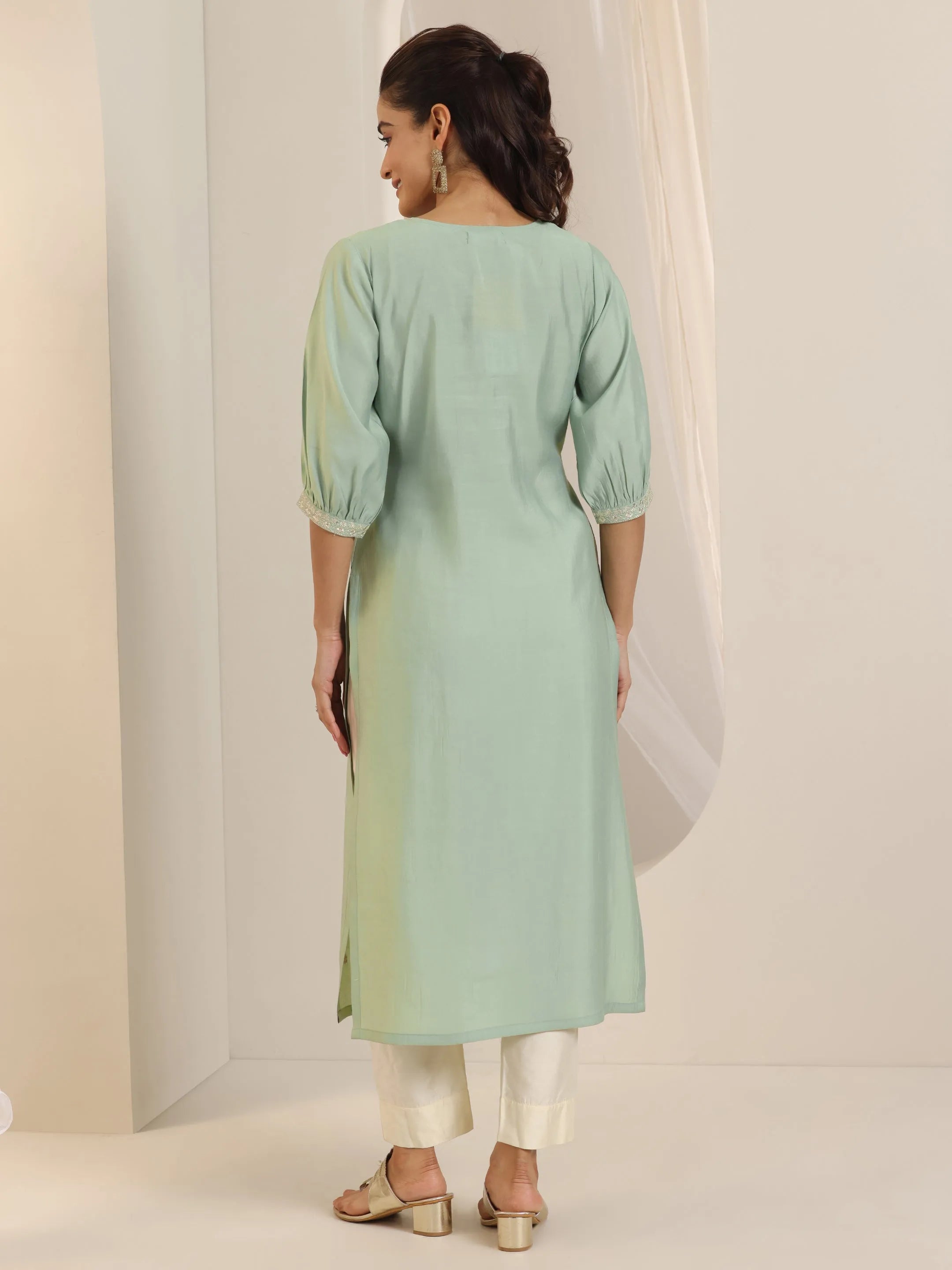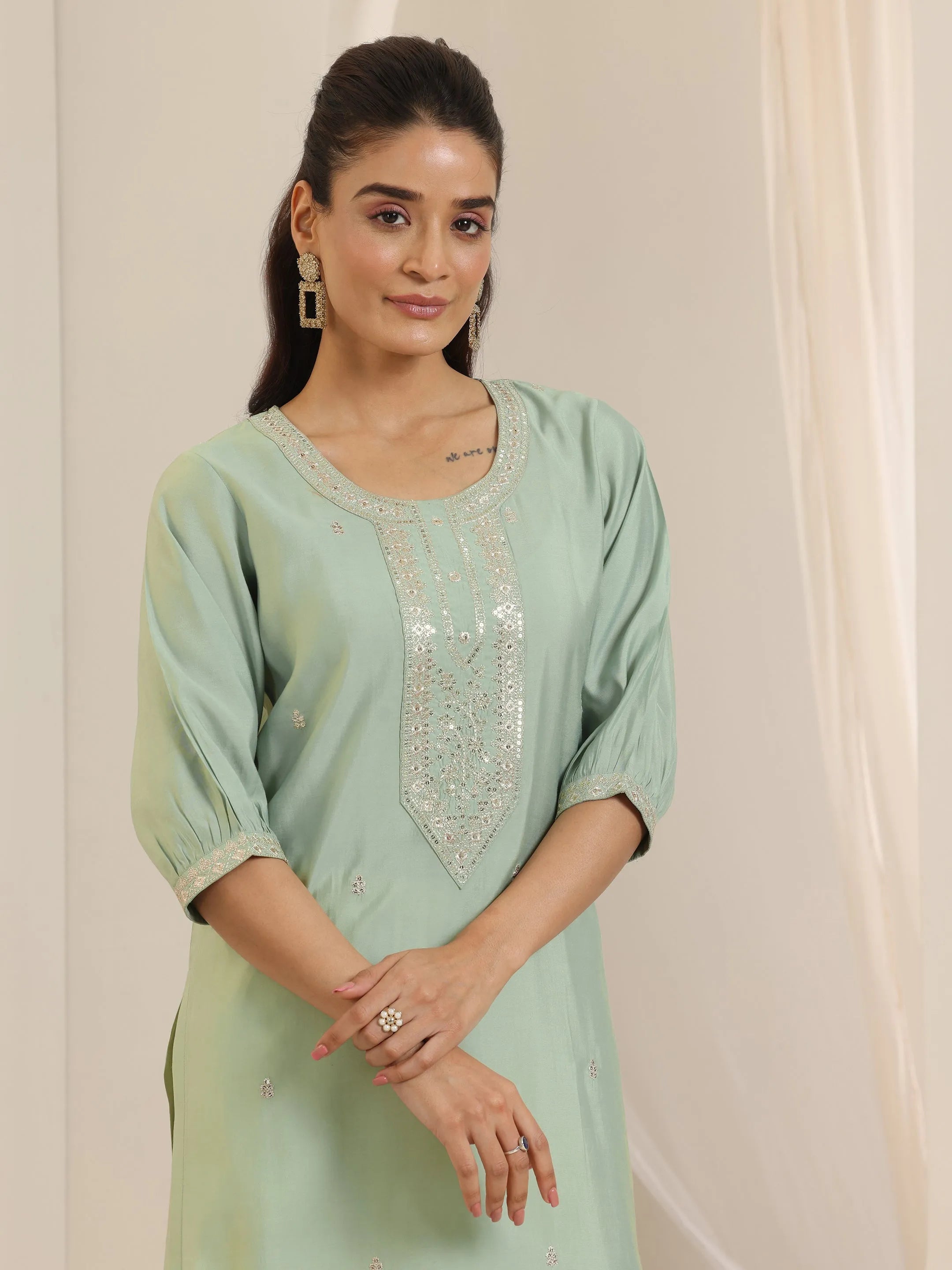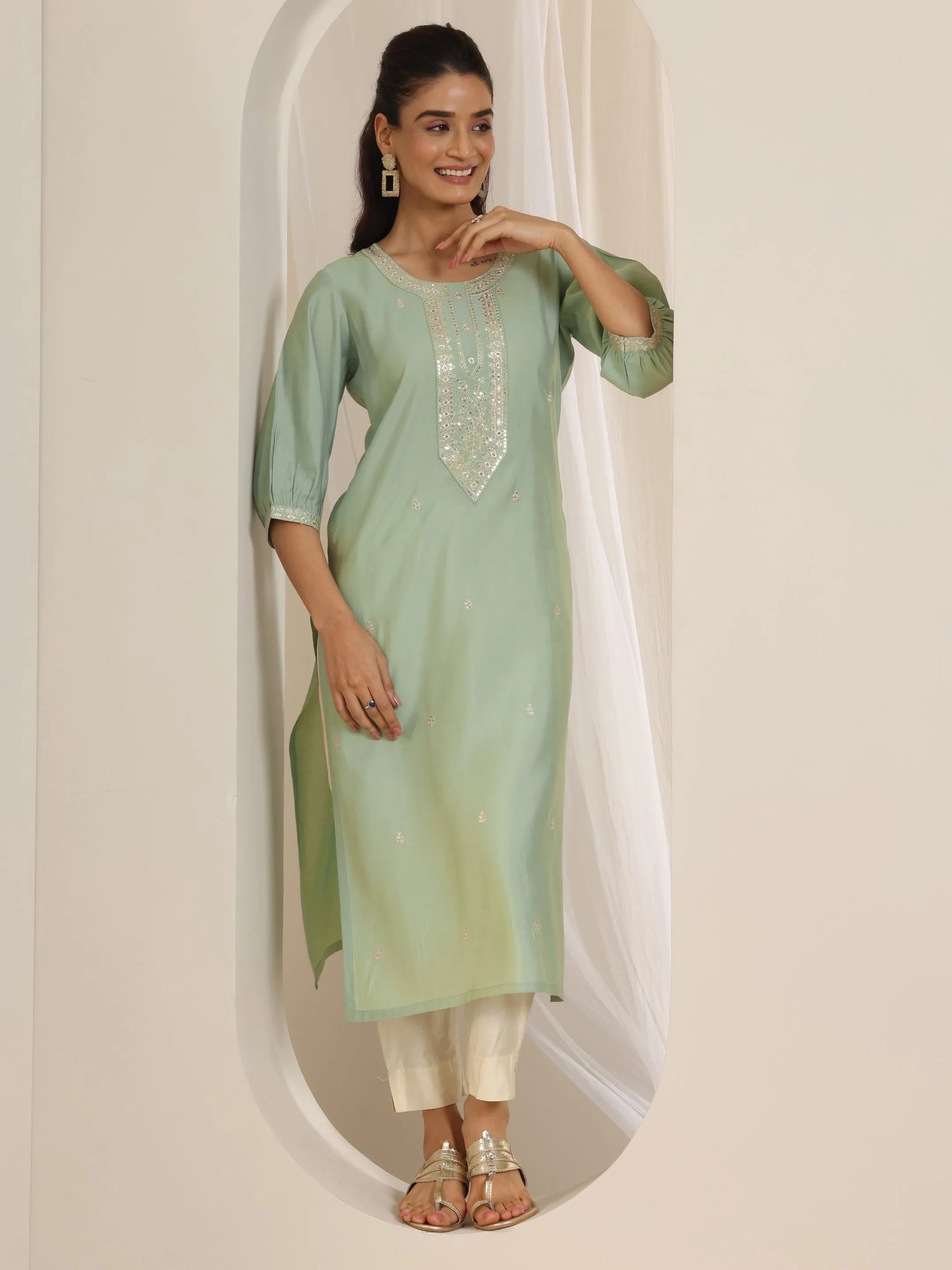Our sea green silk features a straight-fit kurta with a round neckline, regular sleeves. Adorned with embroidered accents, this style is perfect for semi festive occasions.