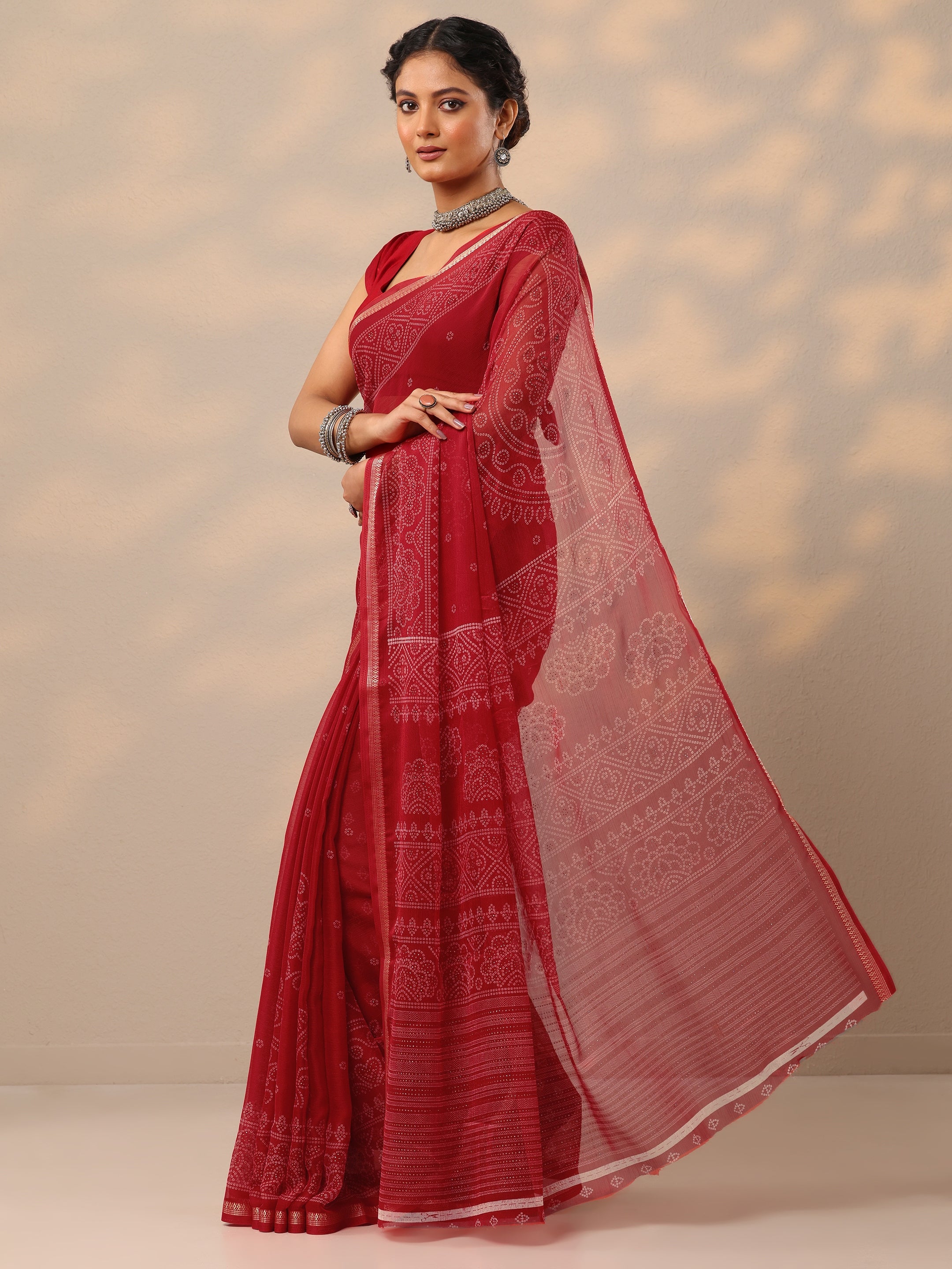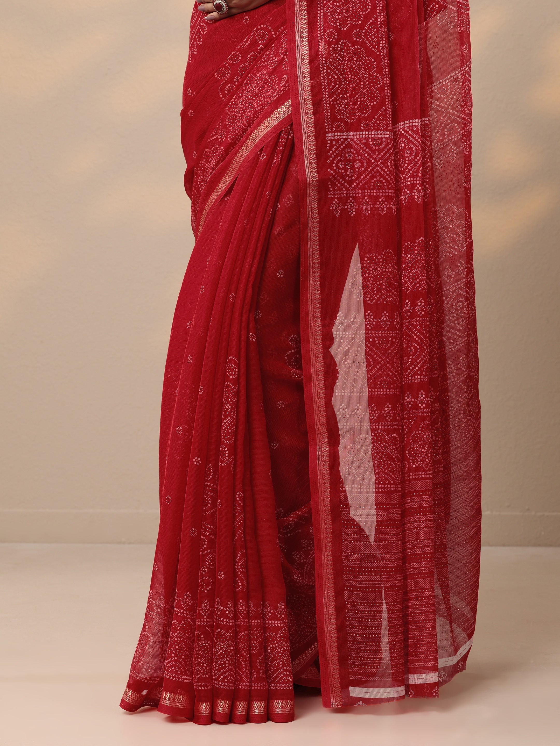 Red Bandhani Printed Chiffon Saree With Unstitched Blouse Piece